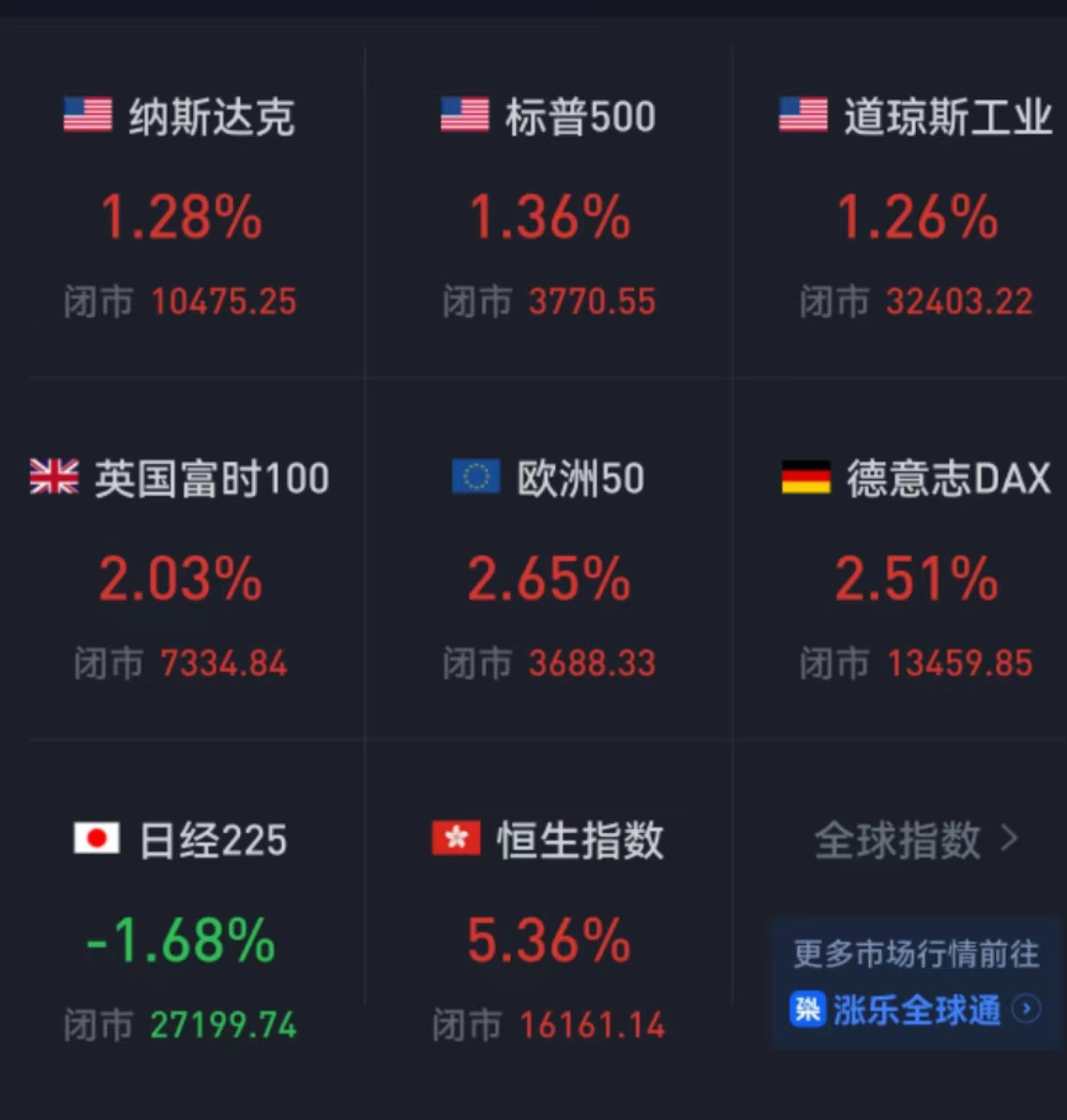 周五,歐洲三大股指收盤全線大漲,本周延續(xù)回升走勢(shì)。德國DAX指數(shù)漲2.51%,周漲1.63%;法國CAC40指數(shù)漲2.77%,周漲2.29%;英國富時(shí)100指數(shù)漲2.03%,周漲4.07%。