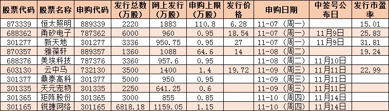 根據(jù)發(fā)行安排,下周(11月7日-11日),將有10只新股發(fā)行,其中創(chuàng)業(yè)板有5只。11月7日發(fā)行的是恒太照明、甬矽電子、新天地;11月8日發(fā)行的是雅葆軒、美??萍?;11月9日發(fā)行的是云中馬、鼎泰高科、天元寵物;11月10日發(fā)行的是矩陣股份、銳捷網(wǎng)絡(luò)。此外,下周將有2只新股首發(fā)上市,耐科裝備、華廈眼科均于11月7日上市。