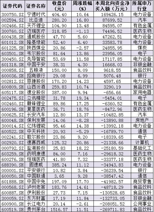 資金方面,周五,北向資金大幅凈買入99.93億元,創(chuàng)9月9日以來新高。本周北向資金累計(jì)凈賣出金額達(dá)50.11億元。從前十大成交活躍股來看,本周,寧德時(shí)代、比亞迪、天齊鋰業(yè)、邁瑞醫(yī)療等4只個(gè)股,北向資金凈買入金額均超7億元。另外,貴州茅臺(tái)、長江電力、東方財(cái)富、伊利股份等個(gè)股遭北向資金凈賣出金額均超10億元。