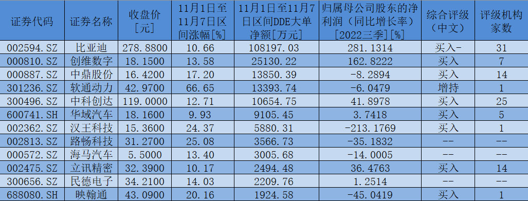 表:11月1日至11月7日,獲大單資金凈流入額超1000萬元的智能汽車板塊個股一覽