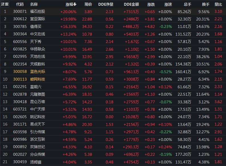 11月10日,傳媒行業(yè)漲幅居首,達2.72%。其中,天地在線、福石控股、天下秀、華揚聯(lián)眾、天娛數(shù)科、宣亞國際6只概念股集體漲停。