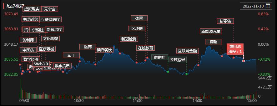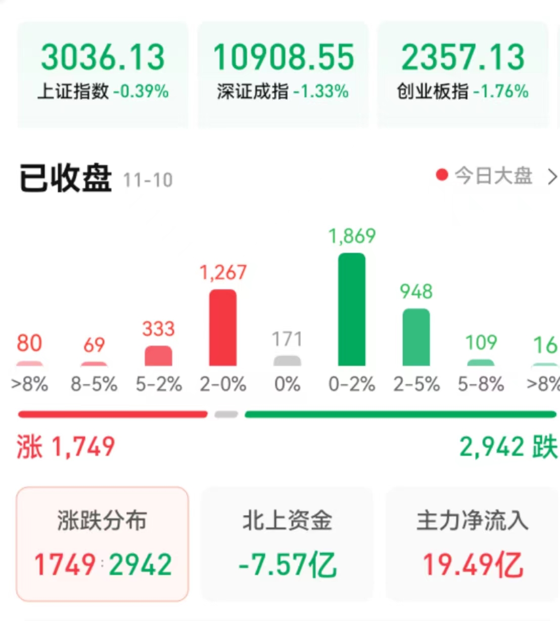 周四(11月10日),A股三大股指震蕩回落,量能依然處于萬億元以下。截至收盤,上證指數(shù)跌0.39%報3036.13點,深證成指跌1.33%報10908.55點,創(chuàng)業(yè)板指跌1.76%報2357.13點;兩市合計成交8428億元,北向資金凈賣出7.57億元??傮w來看,A股個股跌多漲少。
