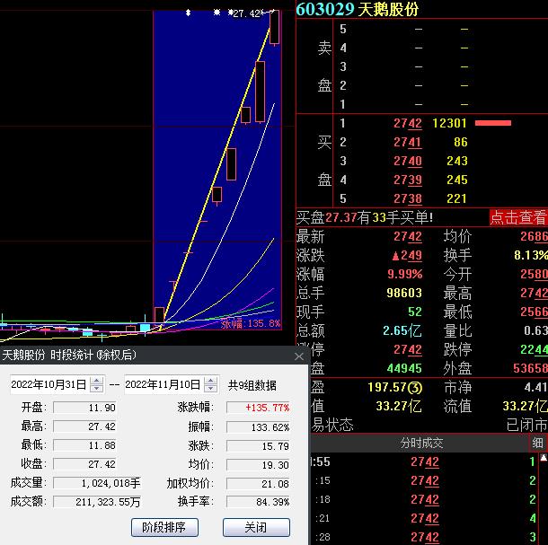 11月10日,供銷社概念龍頭股天鵝股份再度漲停,截至收盤,報27.42元,連續(xù)9個交易日漲停,累計漲幅達135.77%。