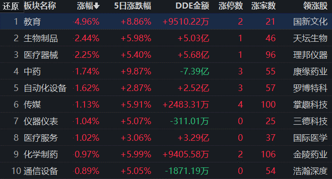 從早盤表現(xiàn)強勢的教育行業(yè)看,該行業(yè)自11:00開始拉升,至11:30,30分鐘內(nèi)漲幅達4.19%。截至11月18日11:30,該行業(yè)交易中的21只個股全線上漲,其中9只漲幅超5%。從資金流向看,該行業(yè)今天上午大單資金凈流入額達9510.22萬元,居行業(yè)第9位。