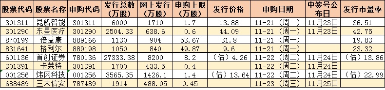 根據(jù)發(fā)行安排,下周(11月21日-11月25日)有8只新股發(fā)行,周一4只:倍益康、格利爾、昆船智能、東星醫(yī)療;周二3只:首創(chuàng)證券、卡萊特、煒岡科技;周三1只:三未信安。