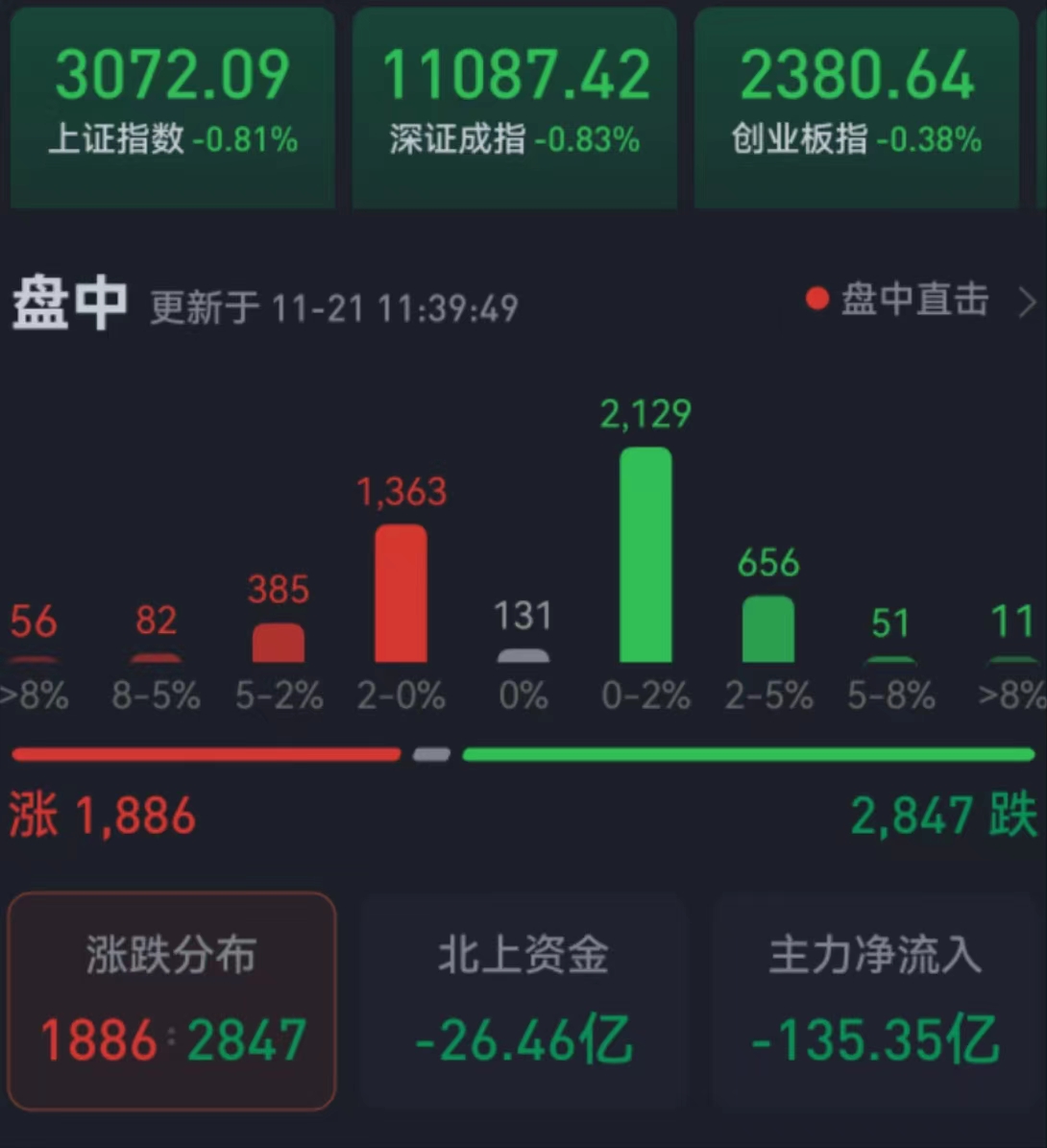 周一(11月21日),三大股指震蕩走弱,全線收綠。截至上午收盤(pán),上證指數(shù)跌幅達(dá)0.81%,報(bào)3072.09點(diǎn);深證成指和創(chuàng)業(yè)板指跌幅分別為0.83%和0.38%;滬深兩市合計(jì)成交額5470.8億元,總體來(lái)看,兩市個(gè)股跌多漲少。