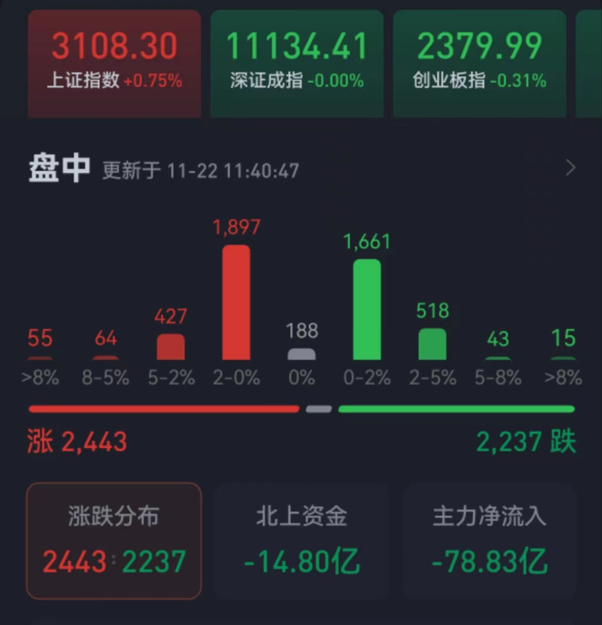周二(11月22日),三大股指震蕩分化,漲跌不一。截至上午收盤,上證指數(shù)漲幅達(dá)0.75%,報(bào)3108.30點(diǎn),收復(fù)3100點(diǎn);深證成指和創(chuàng)業(yè)板指跌幅分別為0%和0.31%;滬深兩市合計(jì)成交額5014.7億元,總體來(lái)看,兩市個(gè)股漲多跌少。