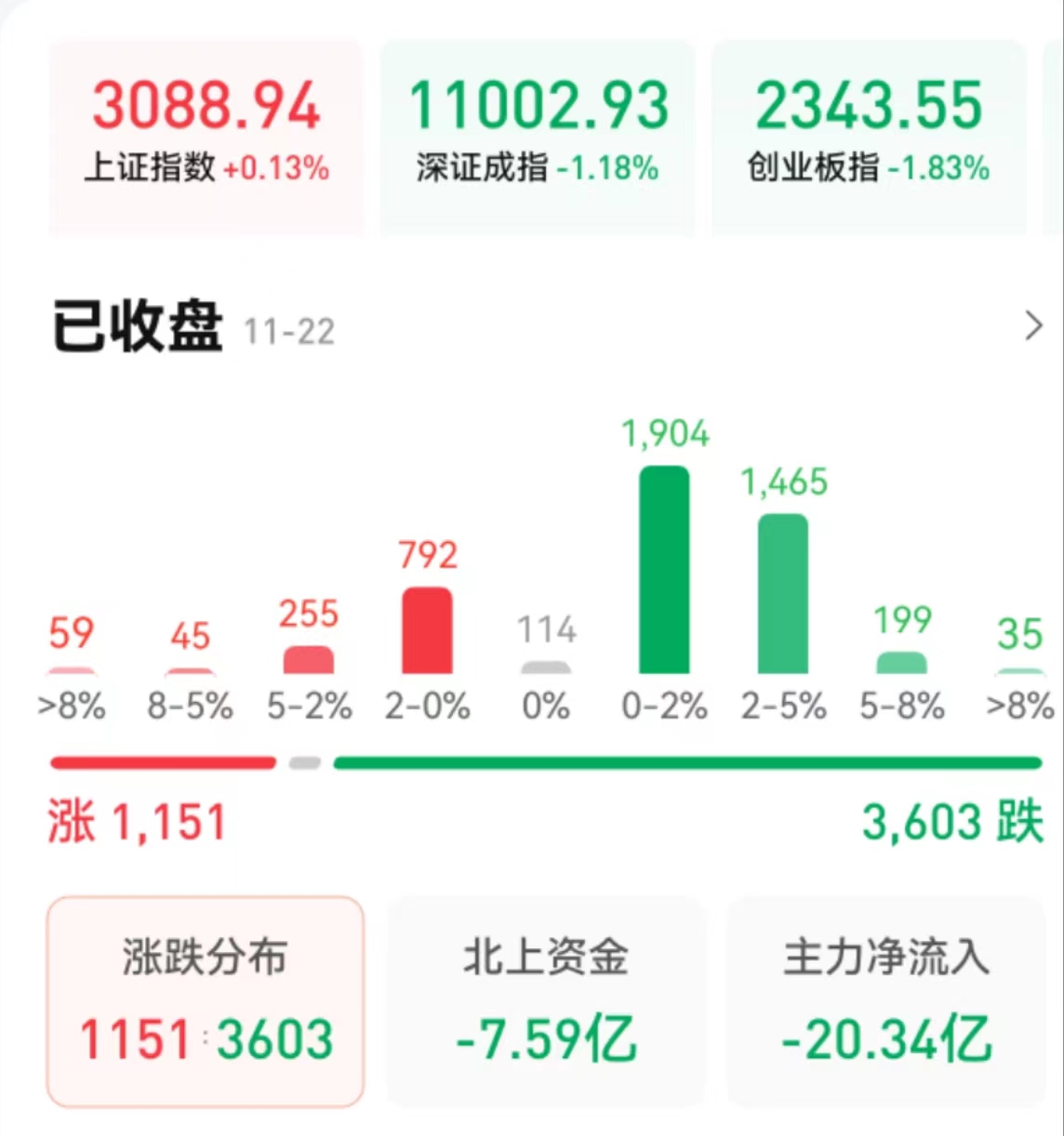 周二(11月22日)截至收盤,上證指數(shù)漲0.13%報(bào)3088.94點(diǎn),深證成指跌1.18%報(bào)11002.93點(diǎn),創(chuàng)業(yè)板指跌1.83%報(bào)2343.55點(diǎn);兩市合計(jì)成交8846億元,北向資金凈賣出7.59億元。總體來看,個(gè)股跌多漲少。