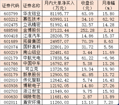 表:月內(nèi)大單資金凈買入超1億元的新能源汽車概念股