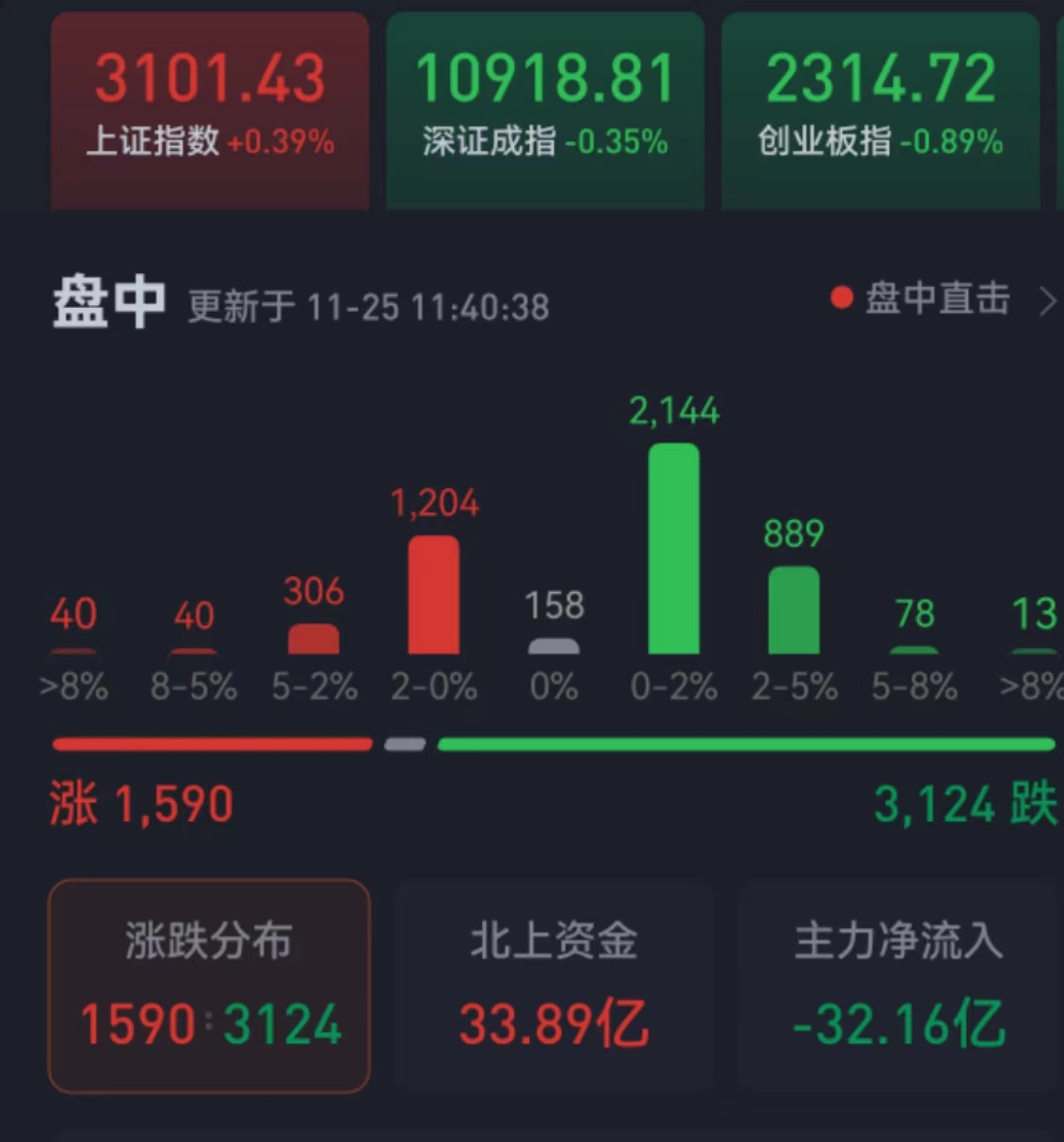 周五(11月25日),三大股指震蕩分化,漲跌不一。截至上午收盤,上證指數(shù)漲幅達(dá)0.39%,報3101.43點,重新站上3100點整數(shù)關(guān)口;深證成指和創(chuàng)業(yè)板指跌幅分別為0.35%和0.89%;滬深兩市合計成交額4592.7億元,總體來看,兩市個股跌多漲少。