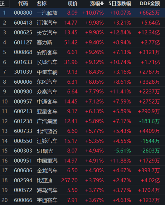 從早盤表現(xiàn)強(qiáng)勢(shì)的汽車整車行業(yè)看,截至11月30日11:30,該行業(yè)交易中的24只個(gè)股全線上漲,其中14只漲幅超5%。從資金流向看,該行業(yè)今天上午大單資金凈流入額達(dá)29.60億元,居行業(yè)第1位。