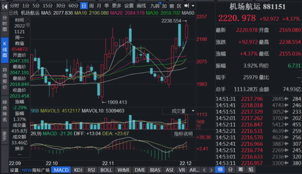 12月5日,最新公布的11月財新中國通用服務(wù)業(yè)經(jīng)營活動指數(shù)(服務(wù)業(yè)PMI)錄得46.7,雖然該指數(shù)較10月下降1.7個百分點,但服務(wù)業(yè)中的一些細分領(lǐng)域市場回暖預(yù)期正持續(xù)強化。當日,A股市場機場航運板塊表現(xiàn)十分強勢,截至收盤,同花順機場航運行業(yè)指數(shù)上漲4.37%,跑贏上證指數(shù)(漲幅1.76%)。機場航運板塊的13只個股全部實現(xiàn)上漲。個股方面,海航控股漲停,廈門空港、海南機場和白云機場漲幅也均超過5%。11月1日至12月5日,機場航運指數(shù)期間累計上漲14.72%,大幅跑贏上證指數(shù)(期間累計漲幅11%)。