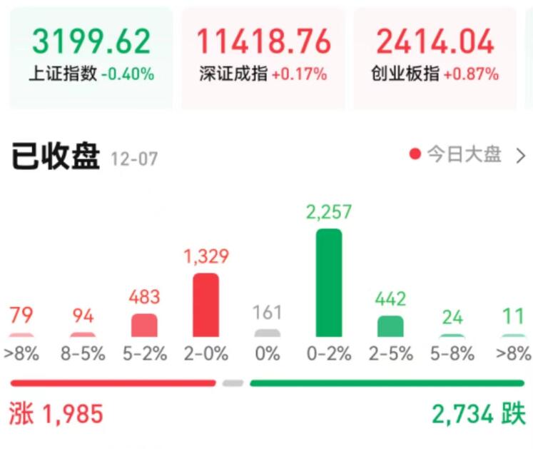 12月7日,A股三大指數(shù)震蕩分化,漲跌不一。截至收盤(pán),上證指數(shù)跌0.4%報(bào)3199.62點(diǎn),深證成指漲0.17%報(bào)11418.76點(diǎn),創(chuàng)業(yè)板指漲0.87%報(bào)2414.04點(diǎn);兩市合計(jì)成交9486億元,北向資金凈買(mǎi)入2.74億元??傮w上看,A股個(gè)股跌多漲少,市場(chǎng)交投熱度略有降低。
