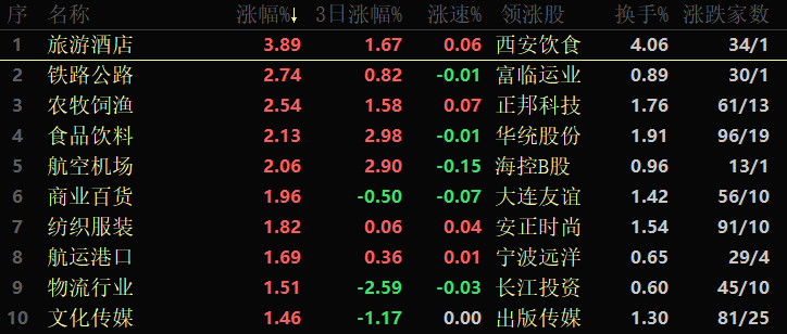 東方財富行業(yè)方面,截至12月13日11:30,86類行業(yè)中39類上漲,占比45.35%,其中,旅游酒店行業(yè)漲幅居首,達(dá)3.89%,鐵路公路和農(nóng)牧飼漁等行業(yè)緊隨其后。醫(yī)療器械行業(yè)跌幅居首,達(dá)2.58%。