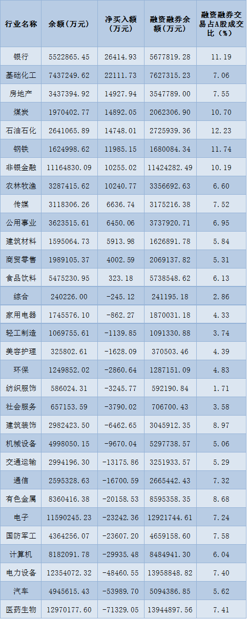 表:12月19日申萬一級行業(yè)兩融交易情況:
