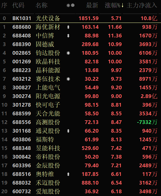 從早盤表現(xiàn)強(qiáng)勢的光伏設(shè)備行業(yè)看,交易中的48只成份股有47只上漲,其中,26只漲幅超5%。資金流向看,光伏設(shè)備行業(yè)大單資金凈流入額達(dá)10.8億元,居行業(yè)第1位。
