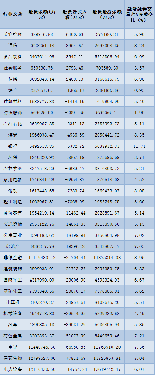 表:12月23日申萬一級行業(yè)兩融交易情況:
