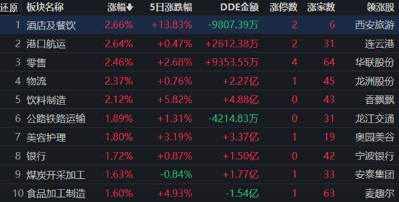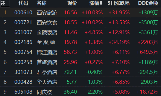 從早盤表現(xiàn)強勢的酒店及餐飲行業(yè)看,交易中的9只成份股有6只上漲,其中2只漲幅超5%。