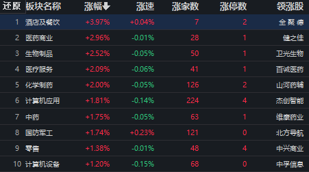 同花順行業(yè)方面,截至12月29日11:30,76類行業(yè)中39類上漲,占比51.32%,其中,酒店及餐飲行業(yè)漲幅居首,達3.97%,此外,醫(yī)藥商業(yè)、生物制品、醫(yī)療服務、化學制藥等4類醫(yī)藥相關板塊漲幅也均超2%。下跌方面,房地產(chǎn)服務跌幅居首,達2.17%。