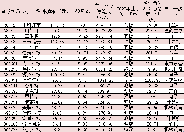 部分業(yè)績(jī)預(yù)喜股在2023年的首個(gè)交易日取得了不錯(cuò)的市場(chǎng)表現(xiàn)。1月3日,上述59只業(yè)績(jī)預(yù)喜股中,截至收盤,有54只業(yè)績(jī)預(yù)喜股股價(jià)實(shí)現(xiàn)上漲,占比超九成。其中,中科江南、愛瑪科技、康冠科技、尚太科技、煒岡科技等個(gè)股均收于漲停,山外山漲幅達(dá)19.98%接近漲停,富樂德、三未信安、長(zhǎng)盈通等3只業(yè)績(jī)預(yù)喜股漲幅也均逾10%。