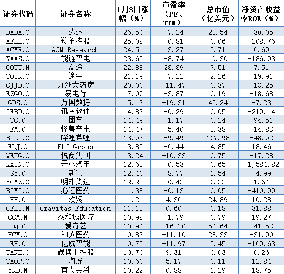 值得關(guān)注的是,在美股走低之際,中概股逆勢走高,截至1月3日收盤,納斯達克中國金龍指數(shù)漲3.76%,直播概念、網(wǎng)絡(luò)視頻、在線旅游等概念領(lǐng)漲,途牛漲幅21.19%,嗶哩嗶哩、歡聚、愛奇藝漲幅超10%。記者通過梳理各大機構(gòu)研報以及對專家采訪發(fā)現(xiàn),三方面因素推動中概股走強: