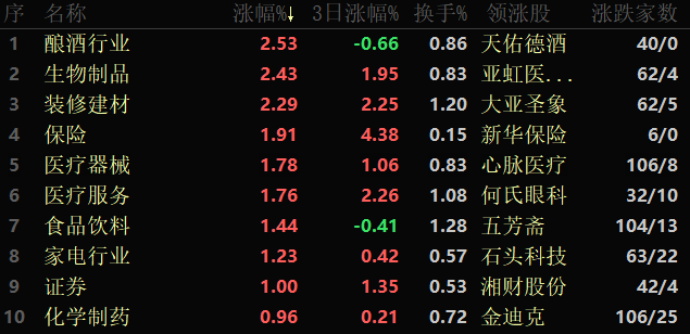 東方財富行業(yè)方面,截至1月13日11:30,86類行業(yè)中48類上漲,占比55.81%,其中,釀酒行業(yè)漲幅居首,達2.53%,此外,生物制品和裝修建材行業(yè)漲幅也超過2%。下跌方面,電源設備行業(yè)跌幅居首,達1.65%。