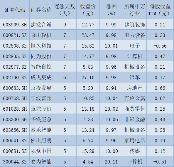 表:連續(xù)上漲5日且今日收盤(pán)漲停股一覽
