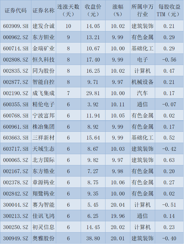 表:連續(xù)上漲6日且今日收盤漲停股一覽