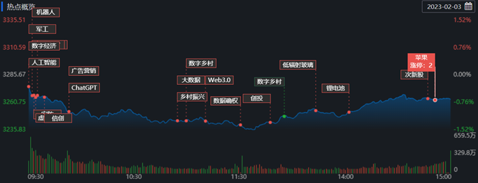 從概念板塊來看,東方財富363個概念板塊中,173個上漲,占比47.66%。ChatGPT概念領漲,漲幅達5.83%,此外,數(shù)據(jù)確權、Web3.0、華為歐拉、虛擬數(shù)字人、遠程辦公、DRG/DIP等板塊漲幅均超3%。下跌方面,毛發(fā)醫(yī)療領跌,跌幅為2.11%,此外,還有包括乳業(yè)、啤酒概念、PVDF概念在內(nèi)的16個概念板塊跌幅均超1%。