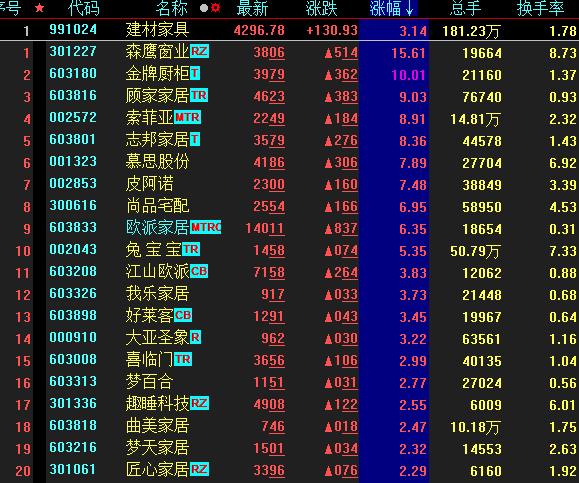 具體看,截至2月20日上午收盤,建材家具板塊表現(xiàn)搶眼,漲幅達(dá)3.14%。其中,金牌櫥柜沖至漲停。