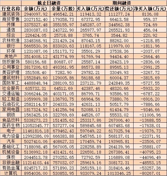 表:2月17日申萬一級行業(yè)兩融交易情況: