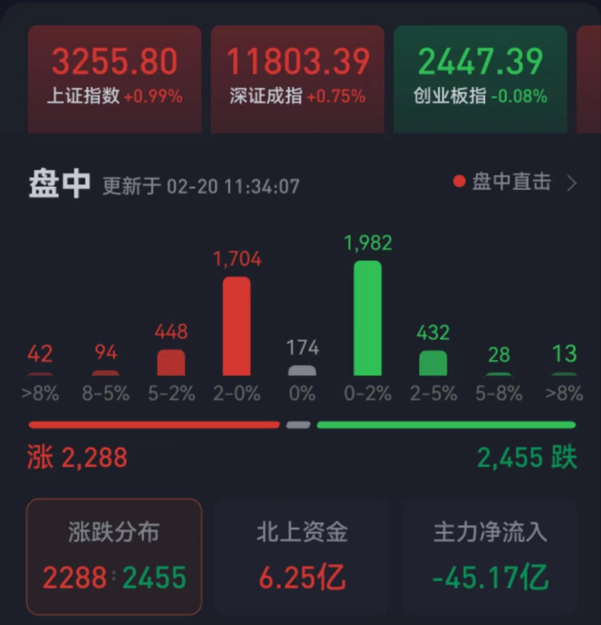 周一(2月20日),三大股指震蕩分化,漲跌不一。截至上午收盤,上證指數(shù)漲幅達(dá)0.99%,深證成指漲幅達(dá)0.75%,創(chuàng)業(yè)板指跌幅為0.08%;滬深兩市合計成交額5571.7億元,總體來看,兩市個股跌多漲少,其中,漲停個股達(dá)21只,跌停個股達(dá)10只。