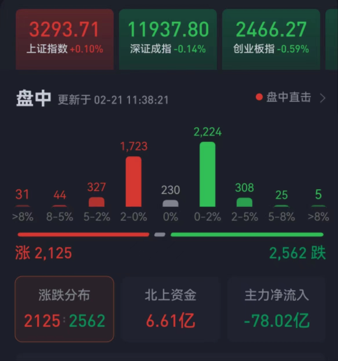 周二(2月21日),A股三大股指震蕩分化,漲跌不一。截至上午收盤,上證指數(shù)漲幅達0.10%,報3293.71點;深證成指和創(chuàng)業(yè)板指跌幅分別為0.14%和0.59%;滬深兩市合計成交額6232.5億元,總體來看,兩市個股跌多漲少。其中,漲停個股達21只,跌停個股達1只。