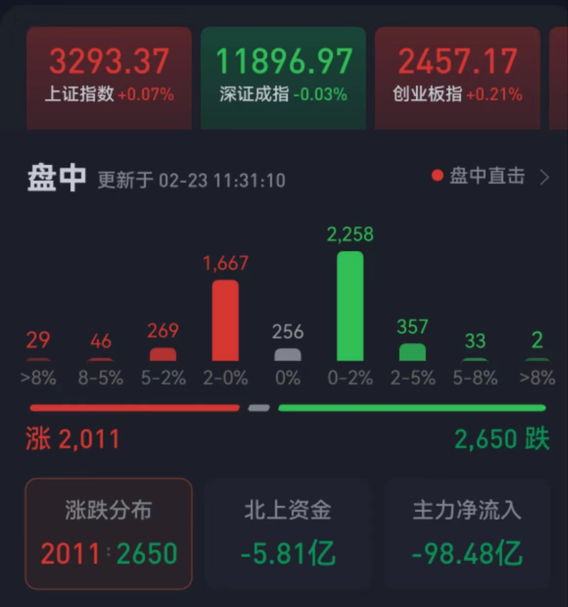 周四(2月23日),三大股指繼續(xù)震蕩分化,漲跌不一。截至上午收盤,上證指數(shù)漲幅達0.07%,報3293.37點;深證成指跌幅為0.03%,創(chuàng)業(yè)板指漲幅達0.21%;滬深兩市合計成交額4881.3億元,總體來看,兩市個股跌多漲少。