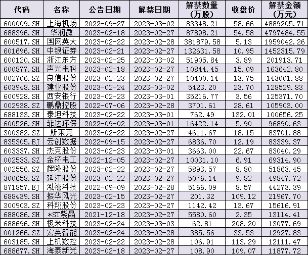 與此同時(shí),統(tǒng)計(jì)顯示,下周(2月27日-3月3日)共有71家公司限售股陸續(xù)解禁,按最新收盤價(jià)計(jì)算,解禁市值為1487.56億元。具體來(lái)看,解禁市值居前三位的是上海機(jī)場(chǎng)(488.9億元)、華潤(rùn)微(479.75億元)、國(guó)網(wǎng)英大(195.9億元)。