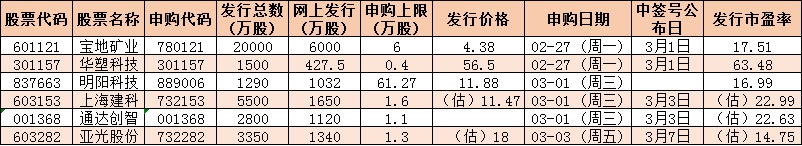 根據(jù)發(fā)行安排,下周(2月27日-3月3日)共有6只新股發(fā)行,其中科創(chuàng)業(yè)板1只(華塑科技)、滬市3只(寶地礦業(yè)、上海建科、亞光股份)、深市1只(通達(dá)創(chuàng)智)、北交所1只(明陽(yáng)科技)。