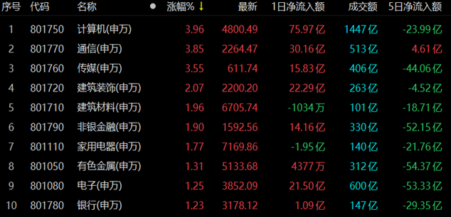 今日,A股三大指數(shù)震蕩上行,量能明顯增長(zhǎng),北向資金凈買(mǎi)入,計(jì)算機(jī)等4類(lèi)申萬(wàn)一級(jí)行業(yè)漲幅超2%。業(yè)內(nèi)人士表示,短線(xiàn)多頭擁有無(wú)畏的做多底氣,有利于后續(xù)行情的演繹。
