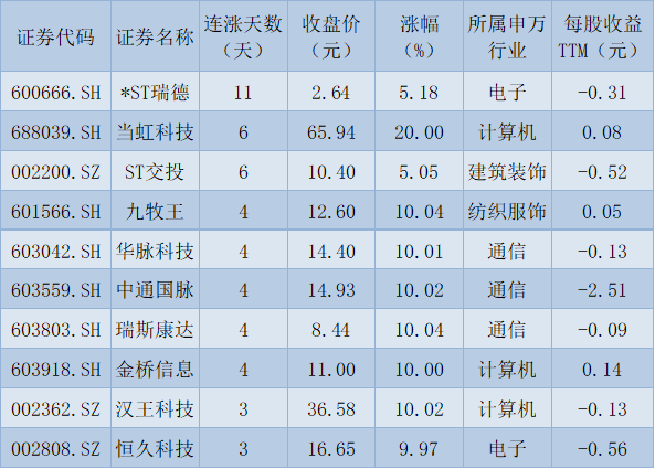 表:連續(xù)上漲3日且今日收盤(pán)漲停股一覽