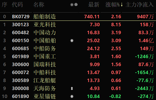 從早盤表現(xiàn)相對強(qiáng)勢的船舶制造行業(yè)看,交易中的10只成分股中有9只上漲,其中,有1只個股漲幅超5%。資金方面,有9407萬元大單資金凈流入該行業(yè),居各行業(yè)第6位。