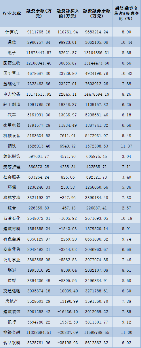 表:3月1日申萬一級行業(yè)兩融交易情況: