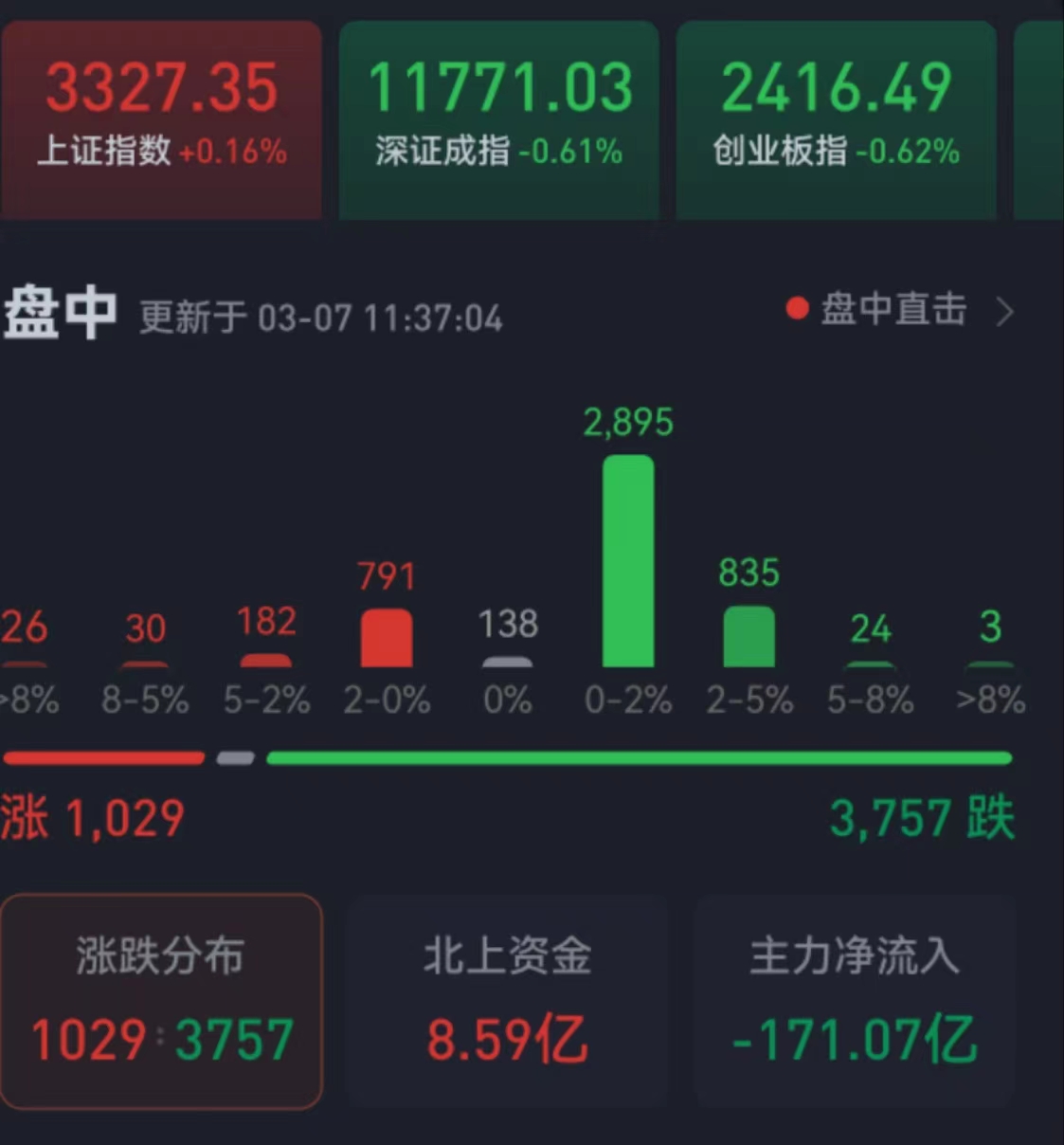 周二(3月7日),三大股指繼續(xù)震蕩分化,漲跌不一。截至上午收盤(pán),上證指數(shù)漲幅達(dá)0.16%,報(bào)3327.35點(diǎn);深證成指和創(chuàng)業(yè)板指跌幅分別為0.61%和0.62%;滬深兩市合計(jì)成交額5476.8億元,總體來(lái)看,兩市個(gè)股跌多漲少。其中,超3700只個(gè)股下跌。