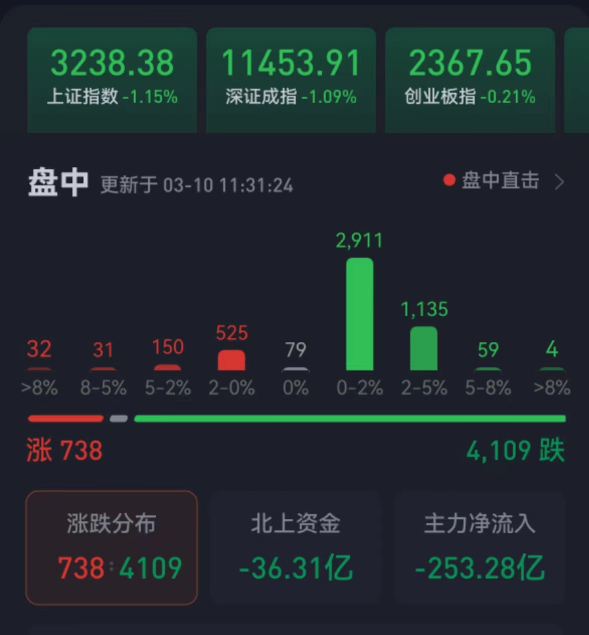 周五(3月10日),三大股指繼續(xù)震蕩回落。截至上午收盤,上證指數(shù)跌幅達1.15%,報3238.38點;深證成指跌幅為1.09%,創(chuàng)業(yè)板指跌幅達0.21%;滬深兩市合計成交額5127.1億元,總體來看,兩市個股跌多漲少,超4000只個股出現(xiàn)下跌。