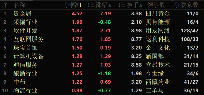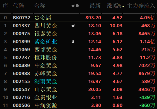 從早盤表現(xiàn)相對強勢的貴金屬行業(yè)看,交易中的11只成份股全線上漲,其中,有4只個股漲幅超5%。資金方面,有4.05億元大單資金凈流入該板塊,居各行業(yè)板塊第7位。