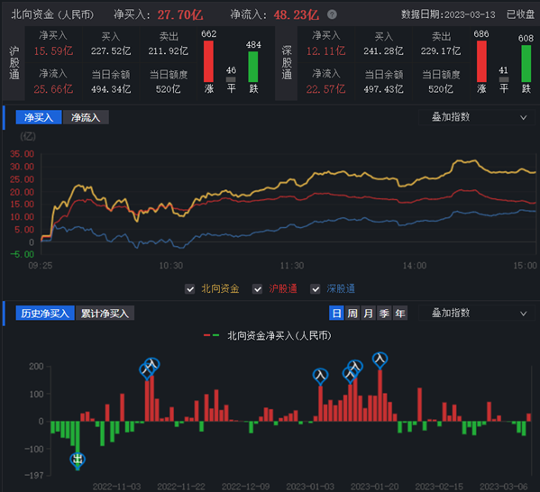 3月13日,滬深兩市三大指數(shù)震蕩分化,滬指表現(xiàn)相對(duì)強(qiáng)勢(shì),K線呈長陽吞陰形態(tài)。截至收盤,上證指數(shù)漲1.20%報(bào)3268.70點(diǎn);深證成指漲0.55%報(bào)11505.02點(diǎn),創(chuàng)業(yè)板指跌0.56%報(bào)2357.07點(diǎn),A股合計(jì)成交額8396.88億元,較前一交易日縮減3.67%,北向資金凈買入27.70億元,滬股通凈買入15.59億元,深股通凈買入12.11億元。總體上看,A股中上漲個(gè)股數(shù)量略少,有2342只上漲,2583只下跌。