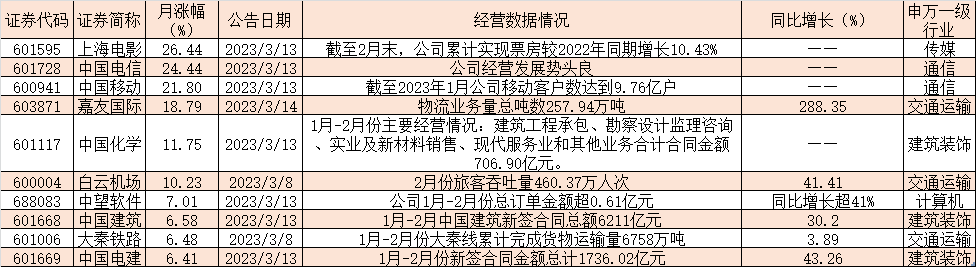 表:已披露2023年前兩個(gè)月經(jīng)營數(shù)據(jù)向好且月內(nèi)漲幅超5%的個(gè)股