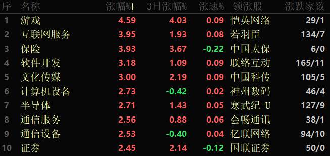 東方財富行業(yè)方面,截至3月17日11:30,86個行業(yè)板塊中76類上漲,占比88.37%,其中,游戲行業(yè)漲幅居首,達4.59%,另有包括互聯(lián)網(wǎng)服務、保險、軟件開發(fā)和文化傳媒等行業(yè)漲幅均超3%。下跌方面,中藥跌幅居首,達0.85%。