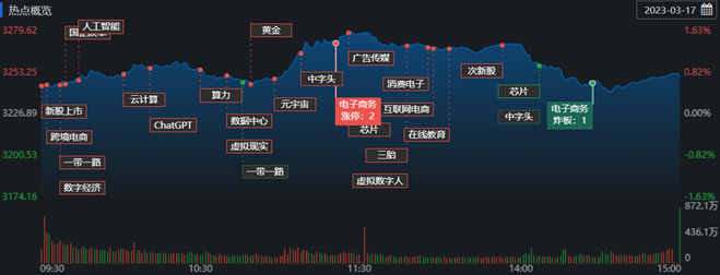 3月17日,滬深兩市三大指數(shù)震蕩分化,滬指日K線走出長(zhǎng)上影的仙人指路形態(tài),深證成指則連續(xù)兩天收盤(pán)處于半年線之下。截至收盤(pán),上證指數(shù)漲0.73%報(bào)3250.55點(diǎn);深證成指漲0.36%報(bào)11278.05點(diǎn),創(chuàng)業(yè)板指跌0.36%報(bào)2293.67點(diǎn),A股合計(jì)成交額9734.32億元,較前一交易日增長(zhǎng)15.14%,北向資金凈買(mǎi)入71.83億元,滬股通凈買(mǎi)入11.45億元,深股通凈買(mǎi)入60.37億元??傮w上看,A股中漲多跌少,有3220只上漲,1696只下跌。