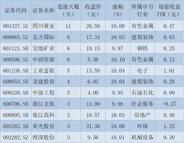 表:連續(xù)上漲3日且今日收盤(pán)漲停股一覽