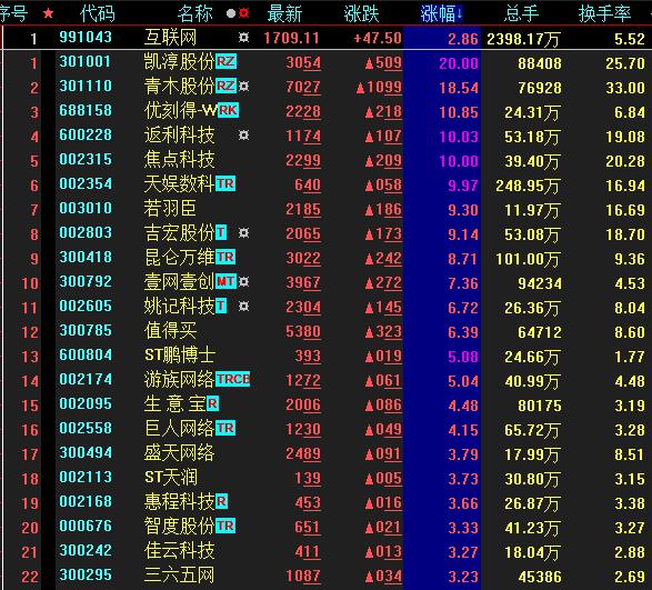 具體看,截至3月21日上午收盤,互聯(lián)網(wǎng)板塊漲幅居首達2.86%。其中,凱淳股份20CM漲停。
