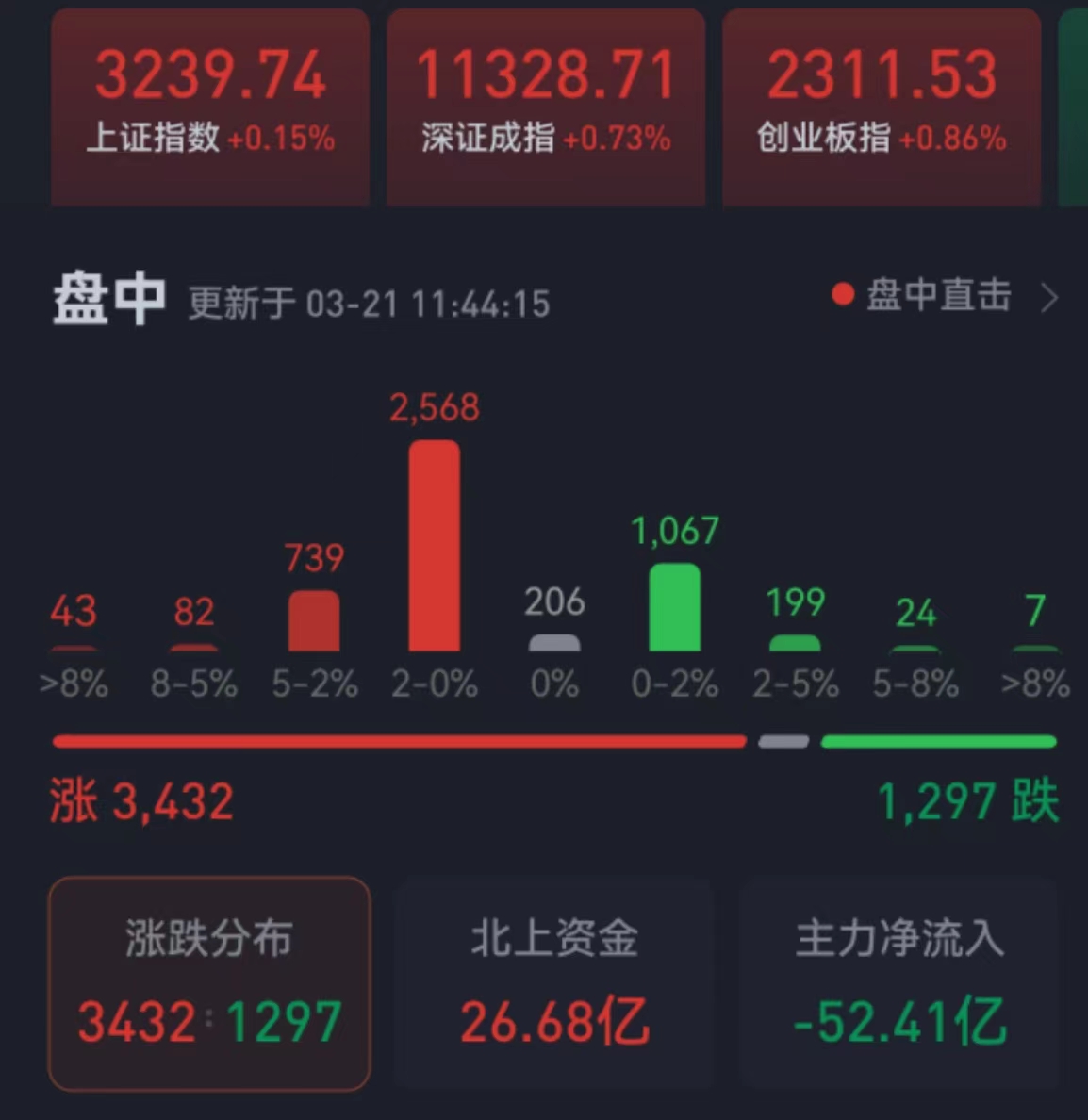 周二(3月21日),A股三大股指震蕩上漲,全線飄紅。截至上午收盤,上證指數(shù)漲幅達0.15%,報3239.74點;深證成指和創(chuàng)業(yè)板指漲幅分別為0.73%和0.86%;滬深兩市合計成交額5107.5億元,總體來看,兩市個股漲多跌少。